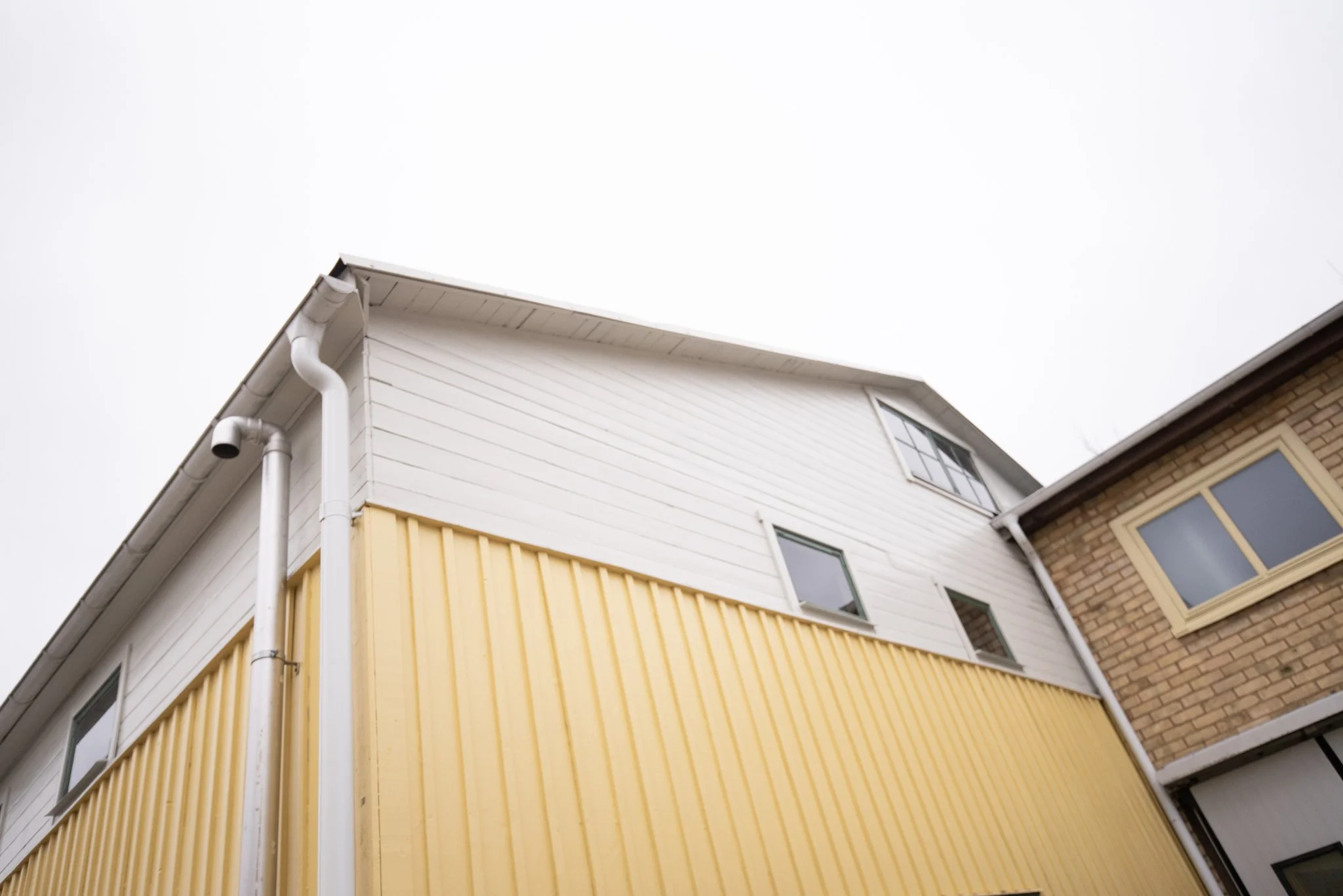 I det första skedet tvättade och målade vi om taket på den ena byggnaden, samt skrapade bort färgen från träfasaden.
