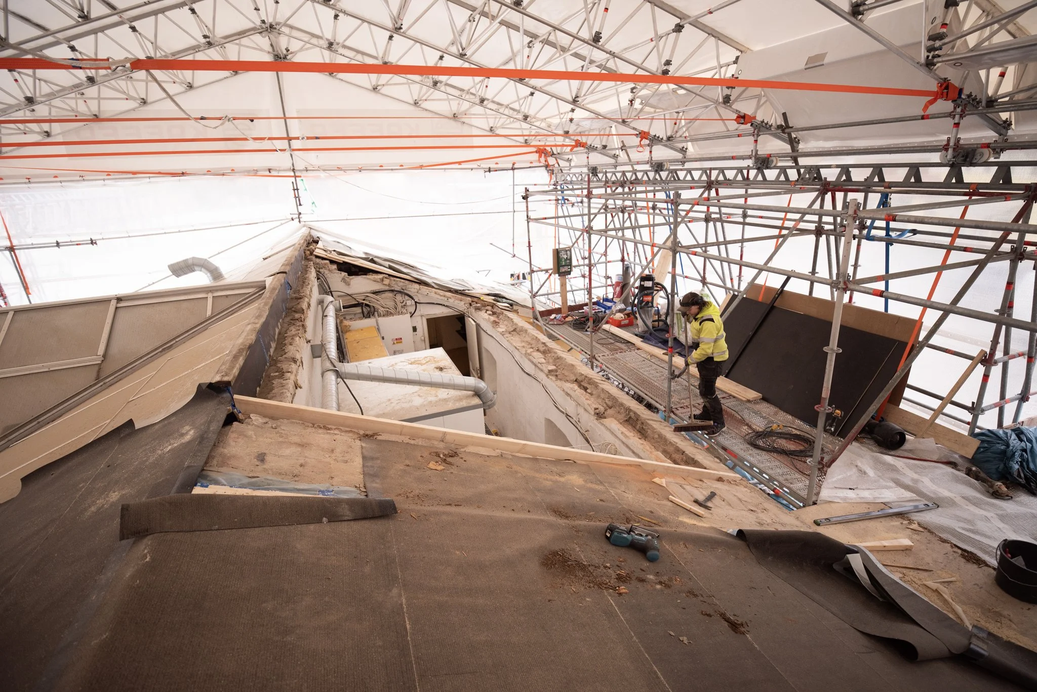 På grund av detta byter vi taket på hela byggnaden som rymmer restaurang, bageri och personalutrymmen. På vissa ställen har vi kunnat behålla det inre taket, men på andra ställen har vi fått riva allt.