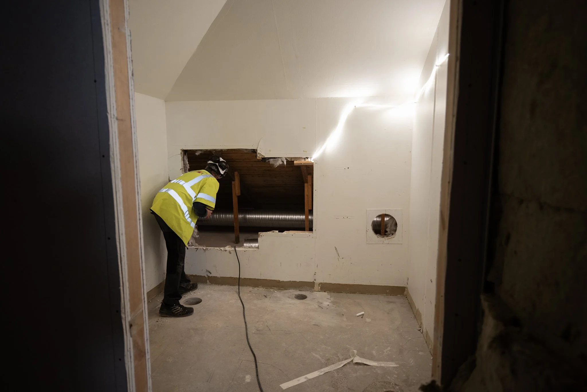 Nya ventilationsrör installeras på vinden.