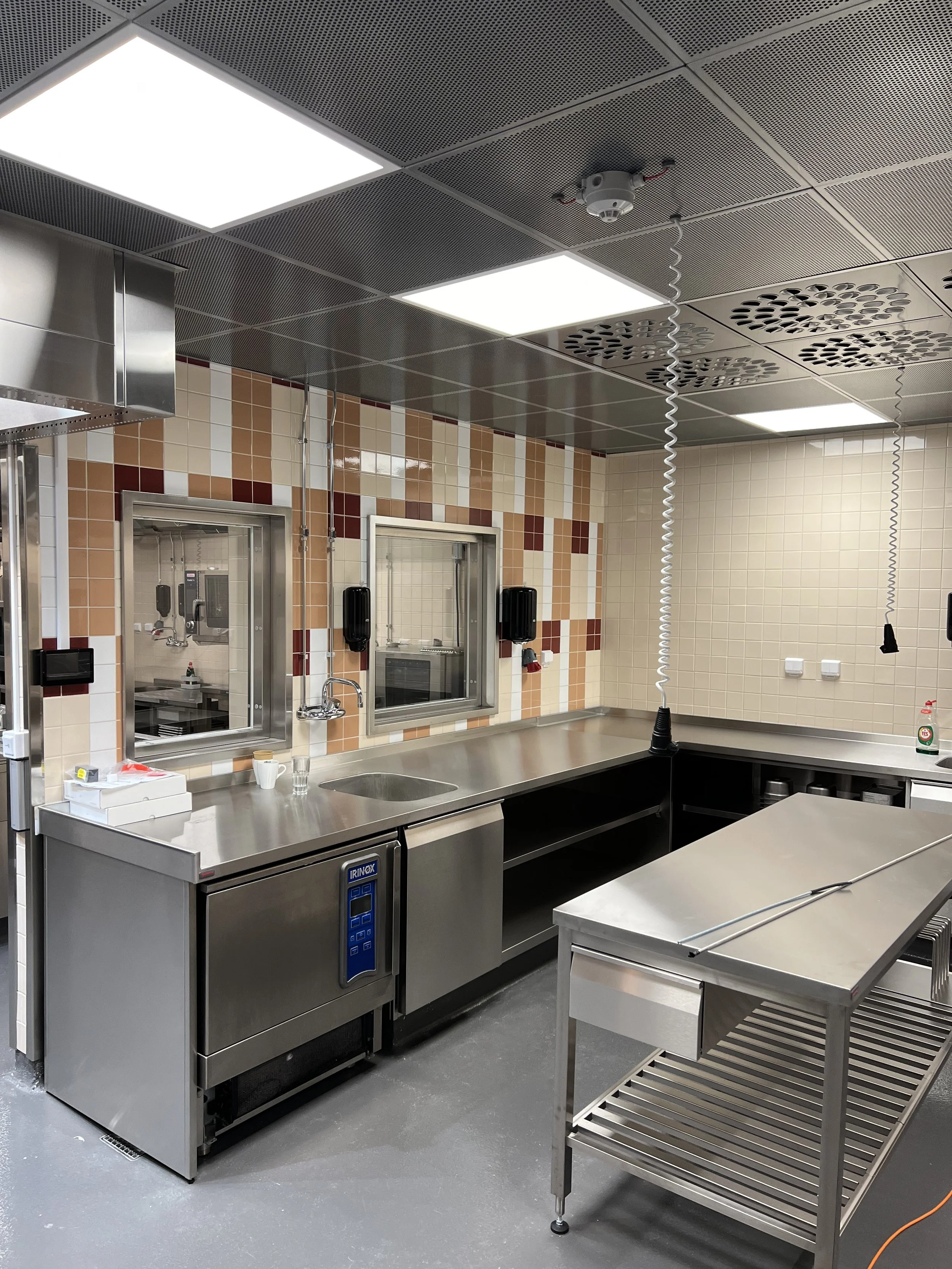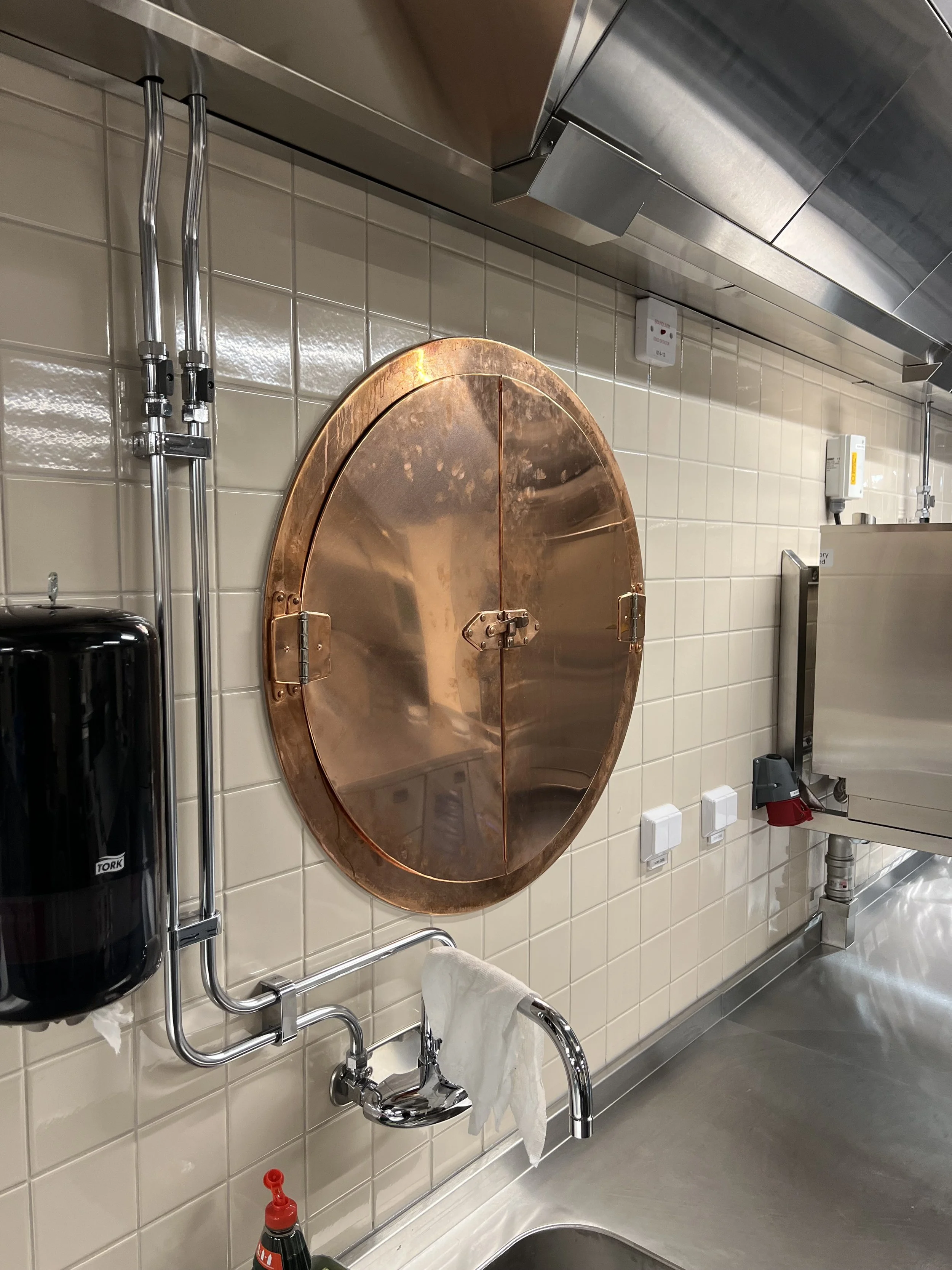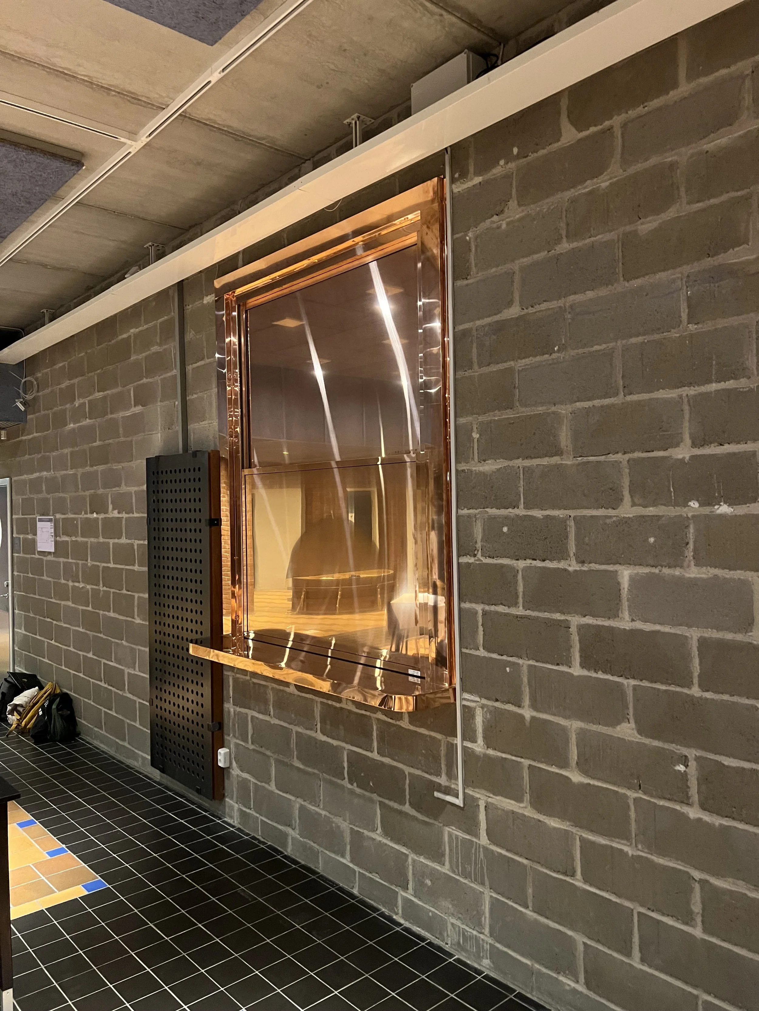 En specialare i detta projekt är fönstret och serveringsluckan i koppar. De sitter båda två på väggen mellan köket och matsalen. Serveringsluckan hörs på namnet vad den används till, och det lilla fönstret är i princip ett titthål ut på gästerna för att personalen i köket ska ha koll på vad som händer ute i matsalen.