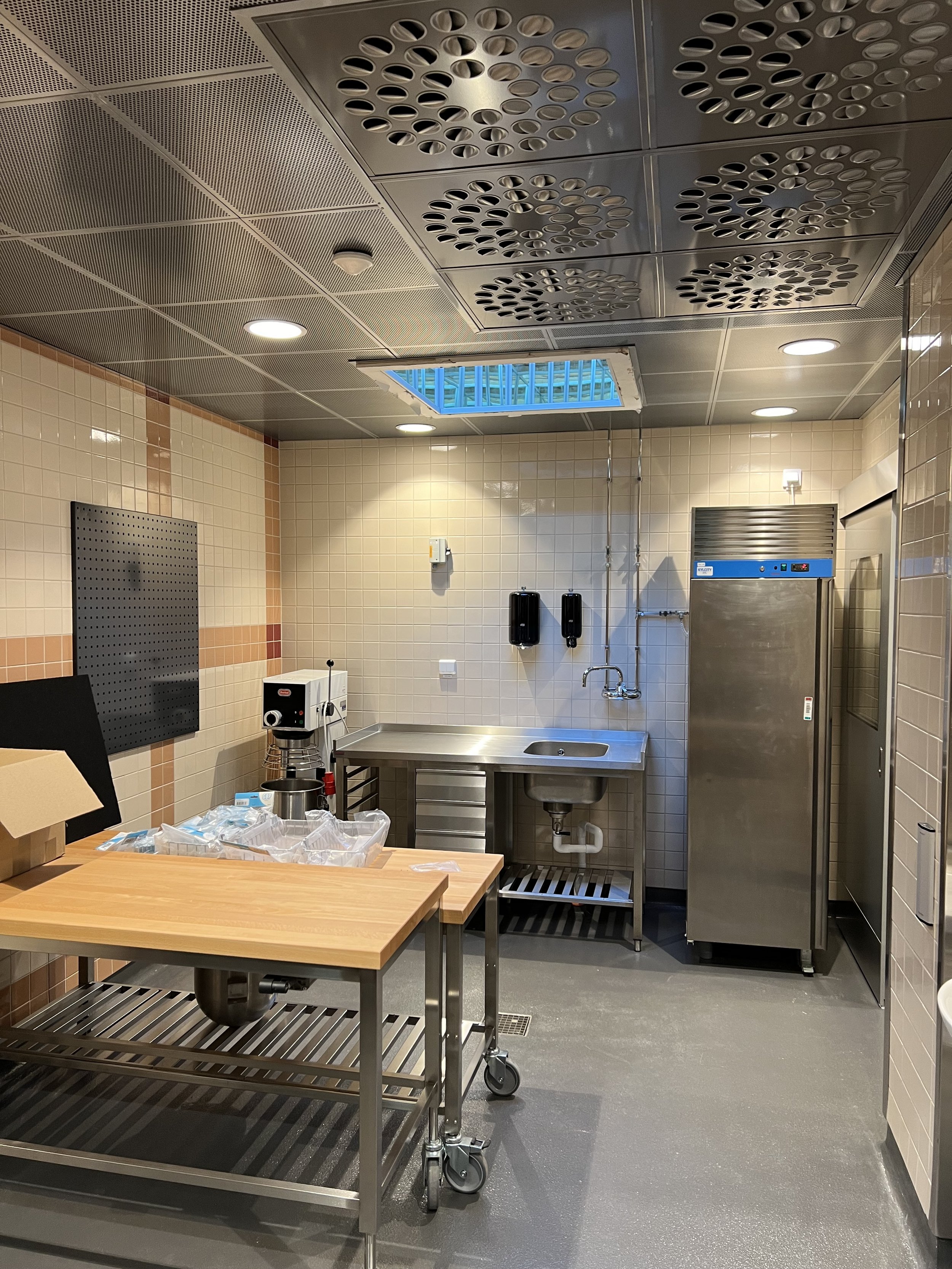 Inne i kökets bageri har vi tagit upp ett takfönster som sedan klätts med spegelglas på insidan, allt för att få ner så mycket naturligt ljus som möjligt till lokalerna som ligger i källarplan.