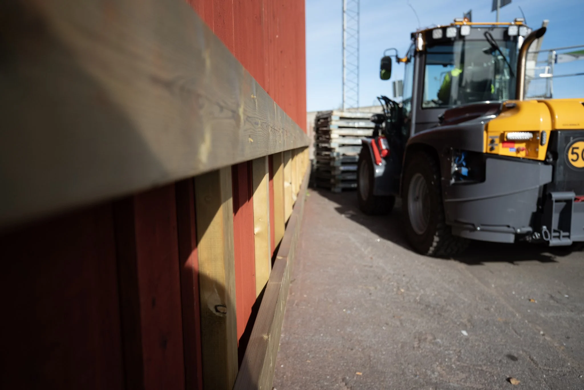Med stora maskiner kommer stora skador. För att skydda fasaderna har vi satt upp specialgjorda lösningar som tar smällarna när exempelvis hjullastarna körs lite för nära byggnaderna.