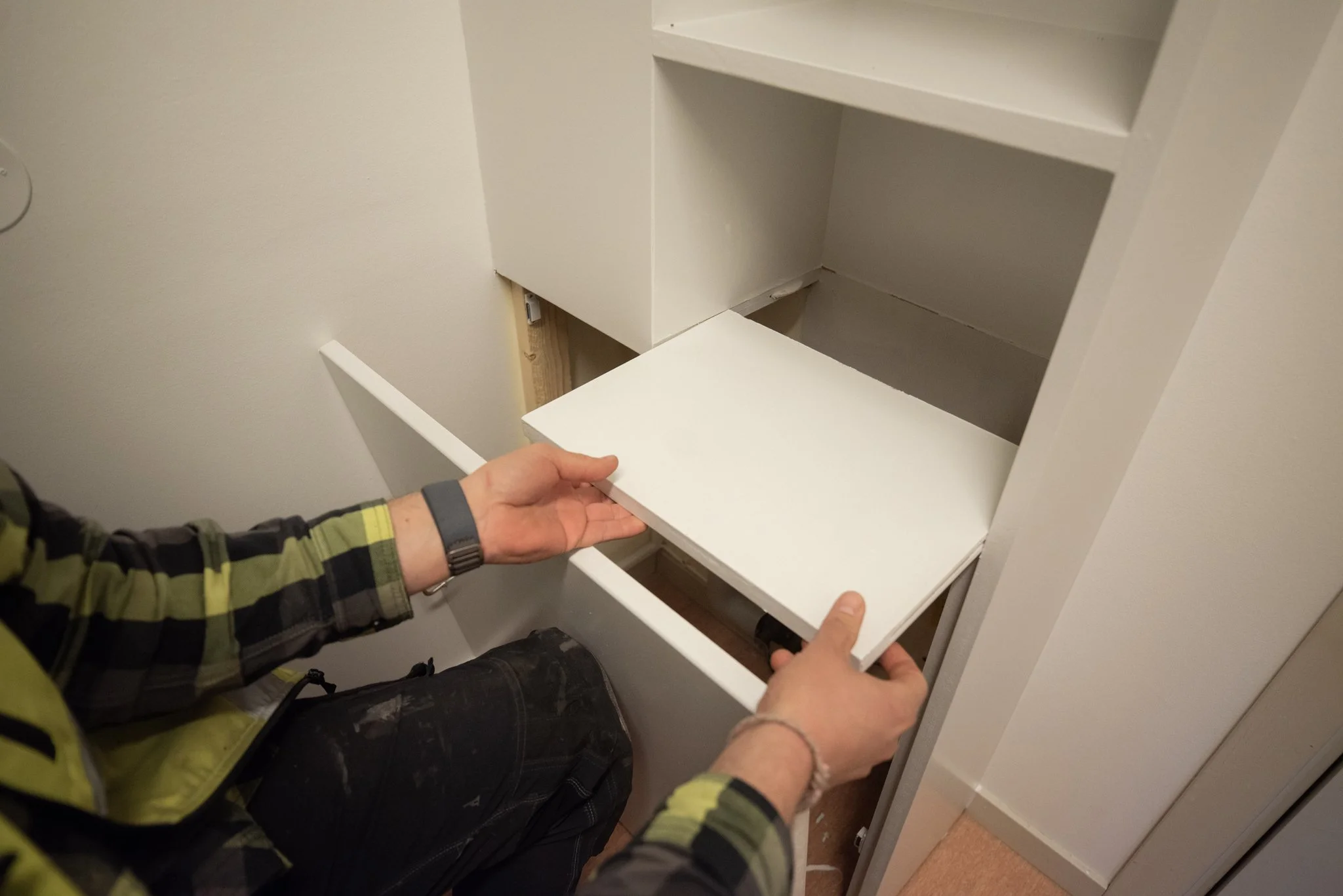 När 30 anställda som går i skift ska dela på ett fåtal skåp i omklädningsrummet fungerar inte de standardlösningar som tidigare fanns på plats på återvinningscentralen i Mellringe. För att utnyttja ytan maximalt och samtidigt rymma alla de funktioner som önskades platsbyggde vi skåp med bänkar och hyllor i både damernas och herrarnas omklädningsrum. Liknande lösning behövdes även på återvinningscentralen vid Atleverken.