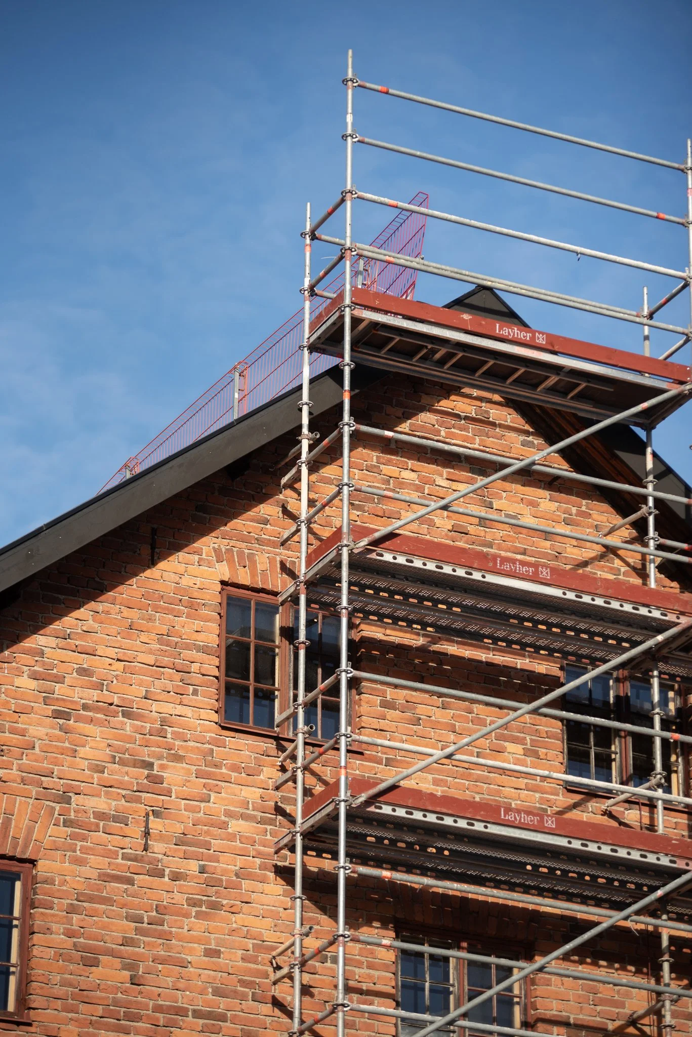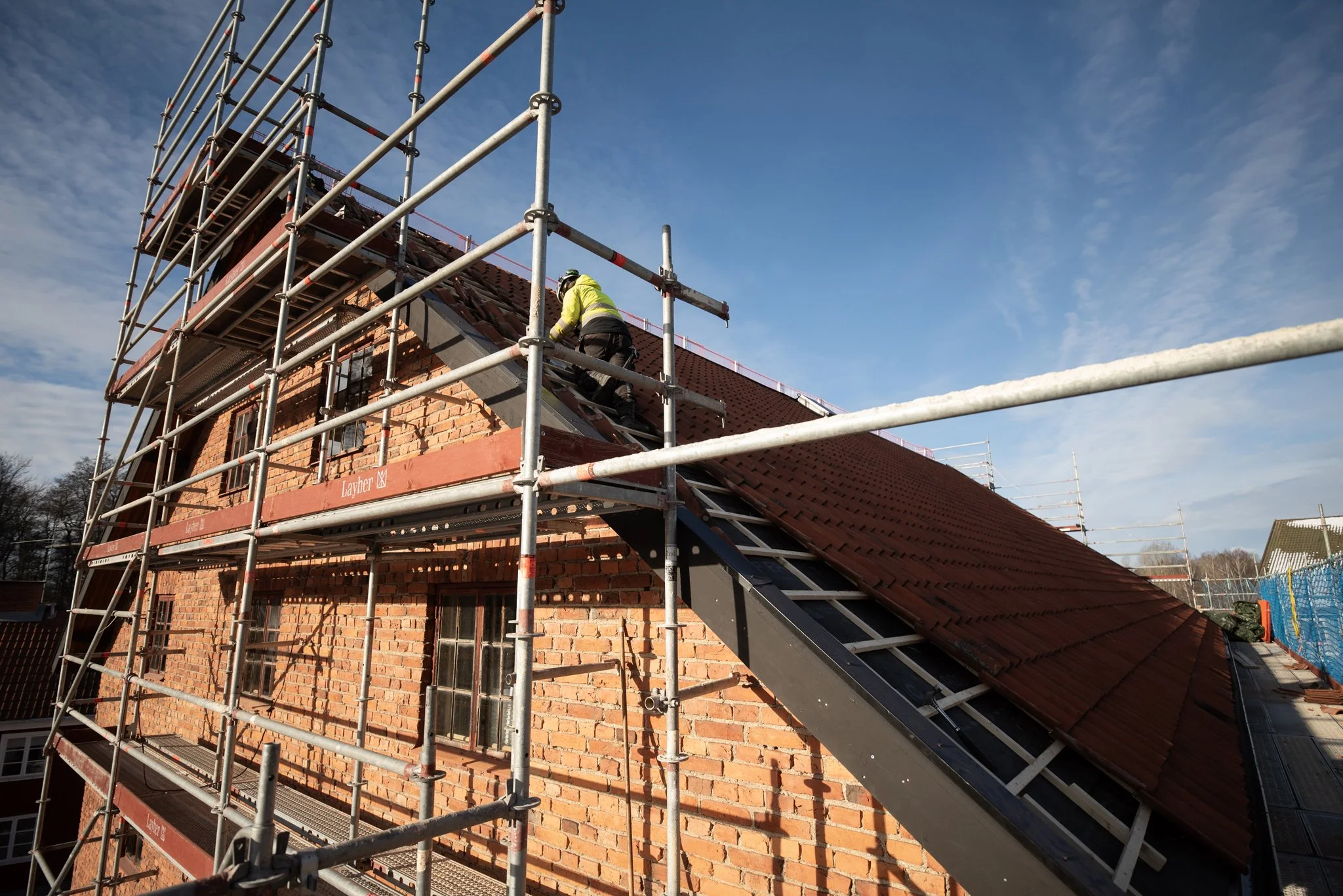 På grund av den höga höjden är säkerhetstänket omfattande på detta projekt. Ställningar pryder de sidor där vi arbetar, och på den andra sidan har ett fallskydd monterats för att skydda vid arbete på nocken.