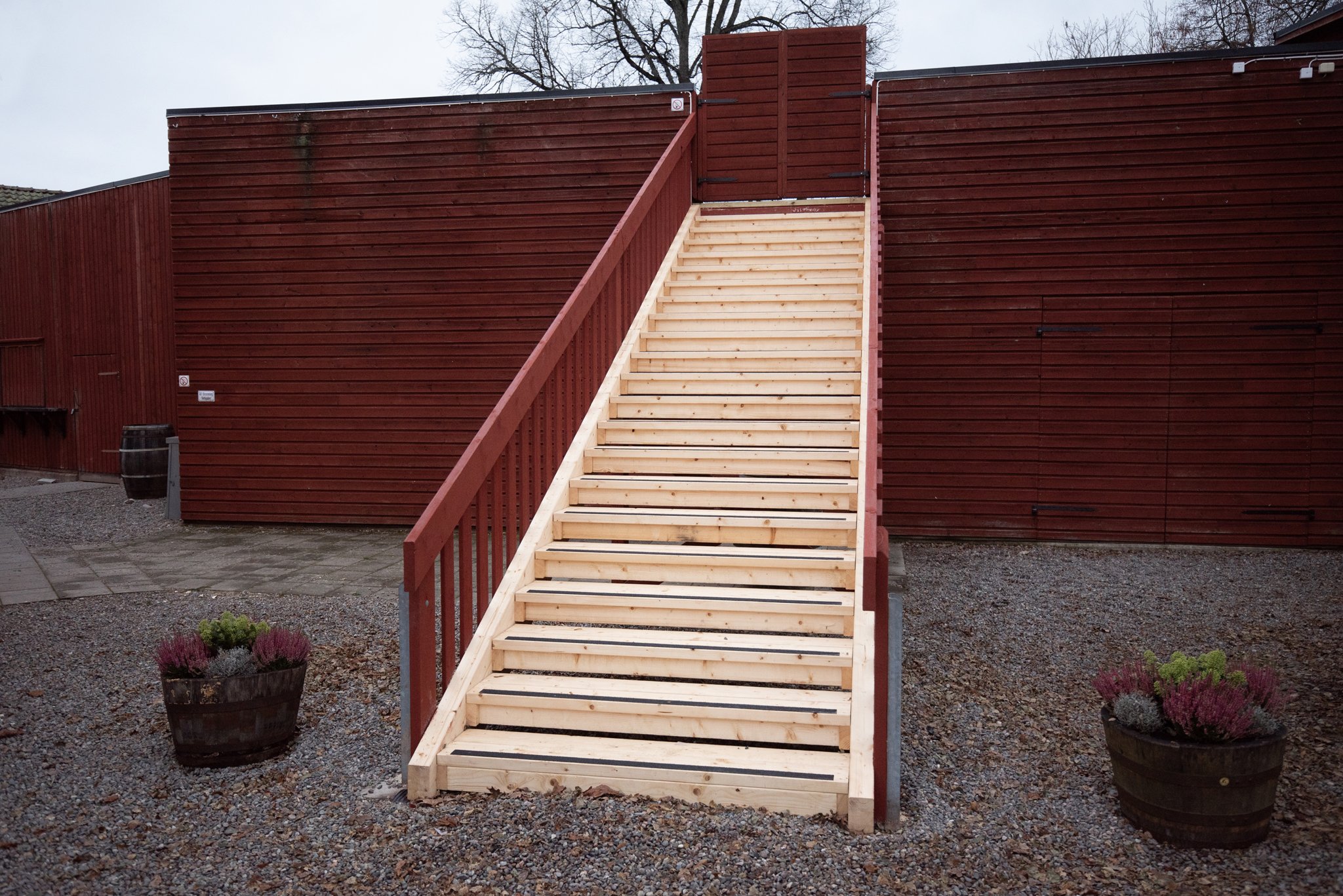 Vagnstyckena till trappan består av sju meter långa limträbalkar som väger 120 kilo styck. Allt annat material är gran.